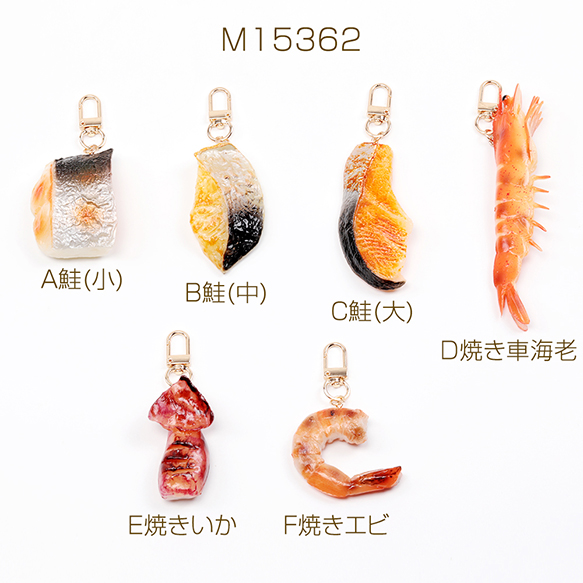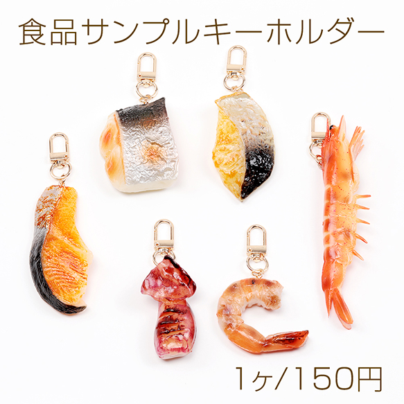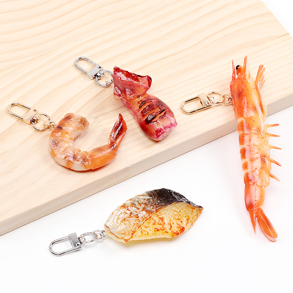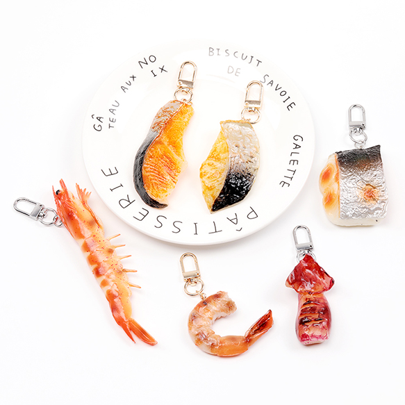 食品サンプルキーホルダー 焼き鮭 鮭切り身 鮭チャーム えび 焼きいか ミニチュアフード 約4.5×10cm(1ヶ)