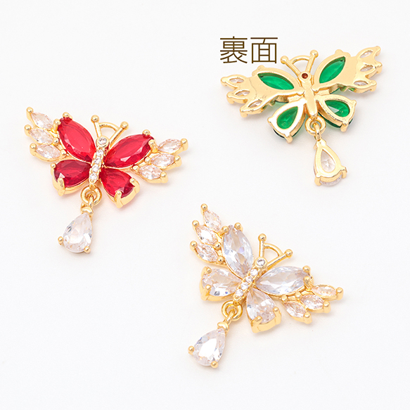ガラスチャーム フラワー 羽ばたく蝶々 揺れるしずく ストーン付き 可憐 メタルチャーム 約20×23mm(1ヶ)