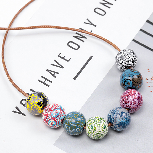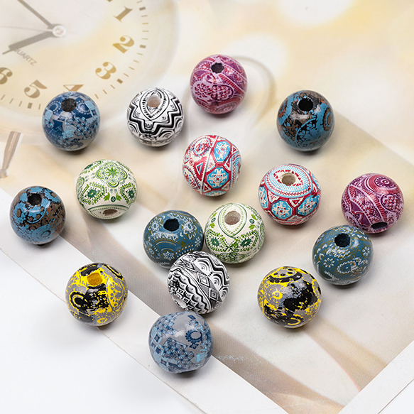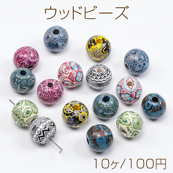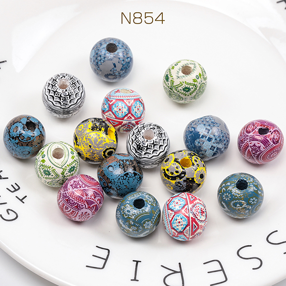 ウッドビーズ ボタニカル柄 レトロ ミックス ※色・模様指定不可 約16mm(口径4mm)(10ヶ)