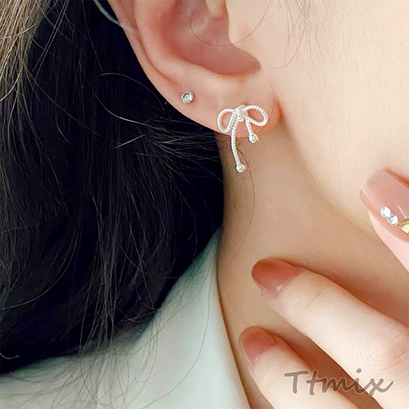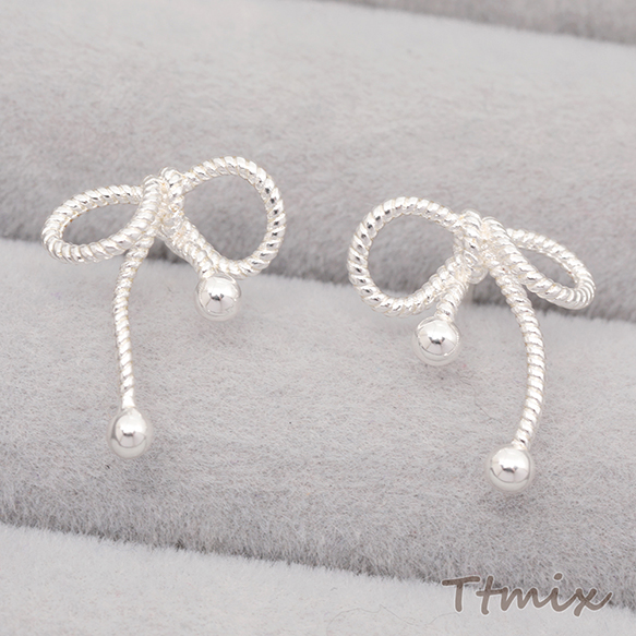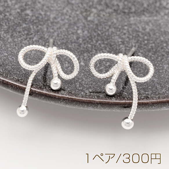 デザインピアス リボン ツイスト 玉飾り付き シンプル ワンポイントピアス メタルピアス 約13×15mm(1ペア)