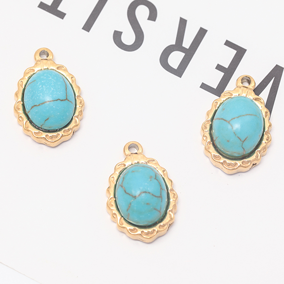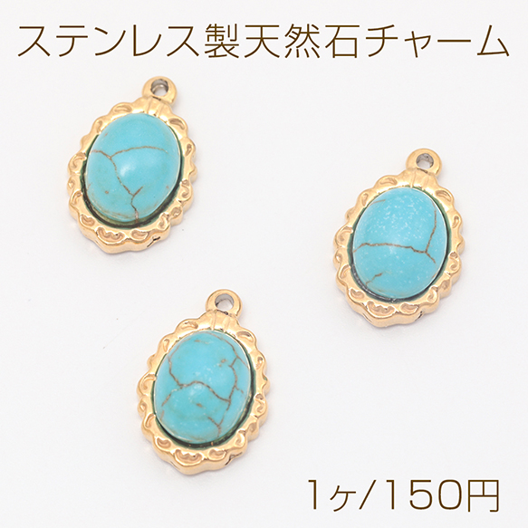 ステンレス製天然石チャーム オーバル ターコイズ 半貴石 電気メッキ加工 SUS304 メタルチャーム(1ヶ)