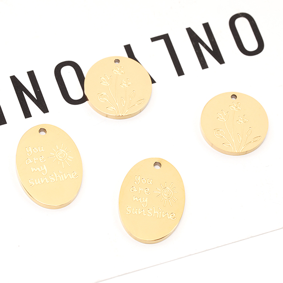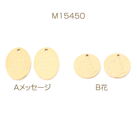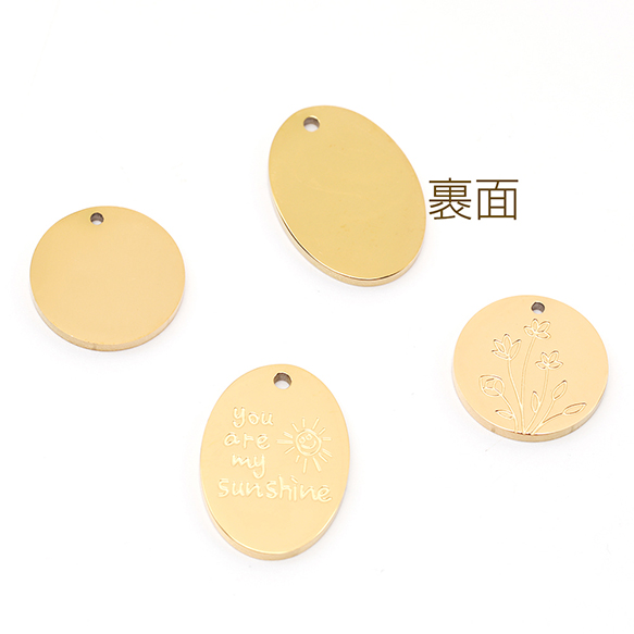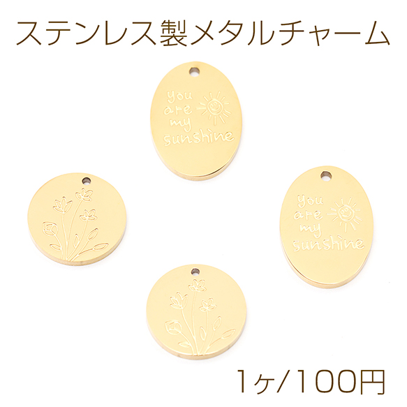 ステンレス製メタルチャーム オーバル メッセージ 花 電気メッキ加工 SUS304 タグ プレートチャーム 全2種(1ヶ)