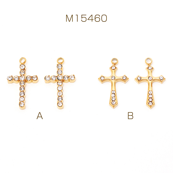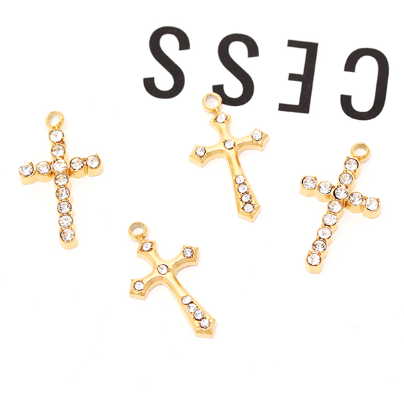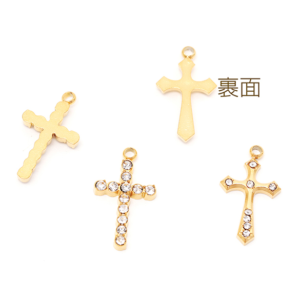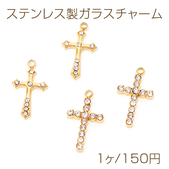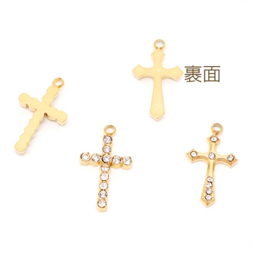 ステンレス製ガラスチャーム 十字架 クロス ラインストーン 電気メッキ加工 SUS304 メタルチャーム 全2種(1ヶ)