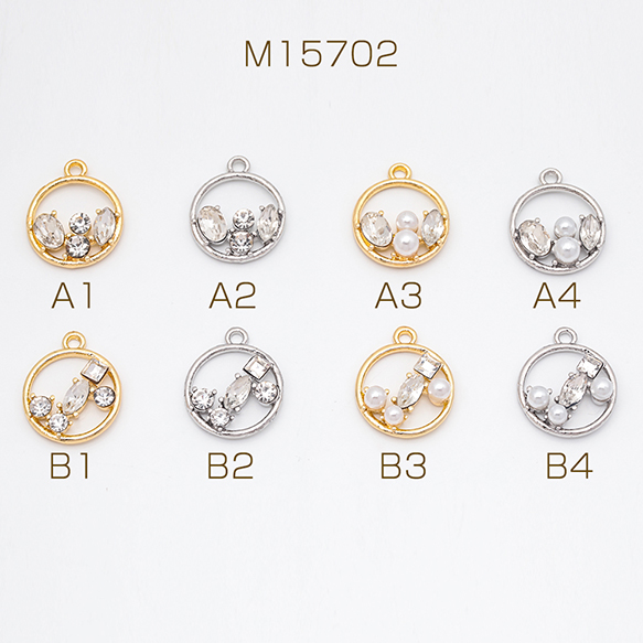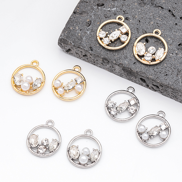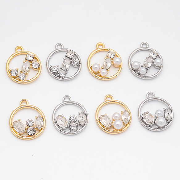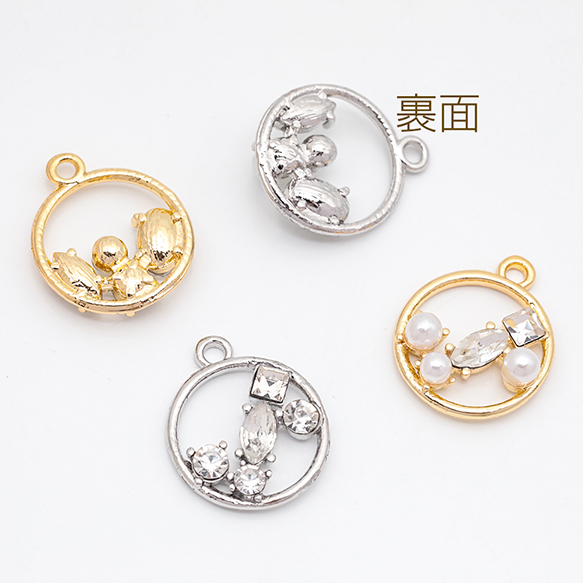 ガラスチャーム ラウンド キラキラ パール・ストーン付き フレームチャーム メタルチャーム 約14×18mm(2ヶ)