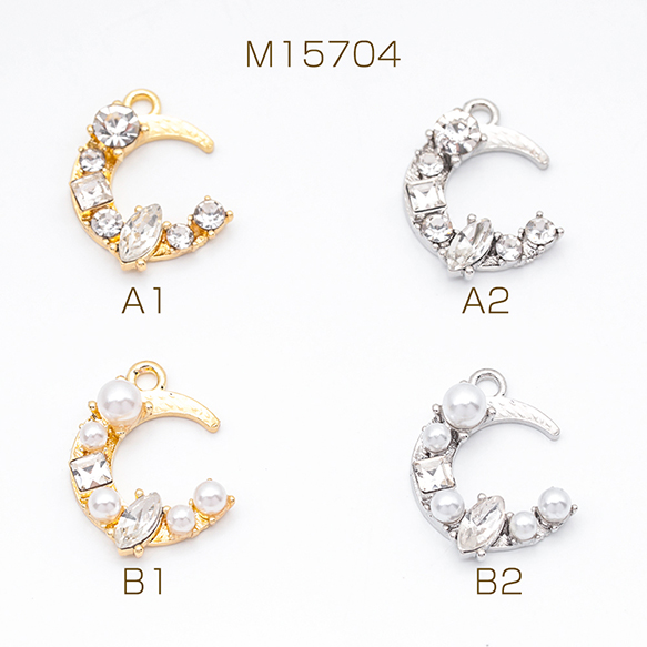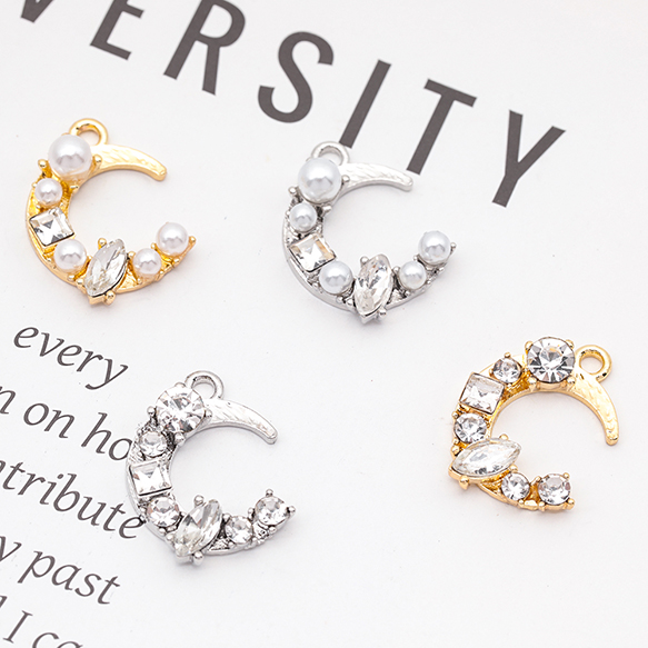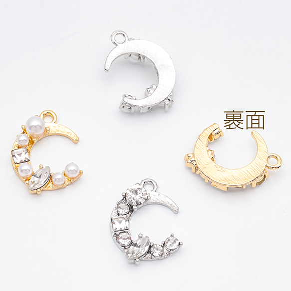 ガラスチャーム 三日月 キラキラ パール・ストーン付き 宇宙チャーム メタルチャーム 約13×18mm(2ヶ)