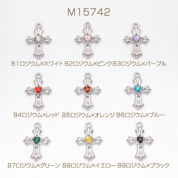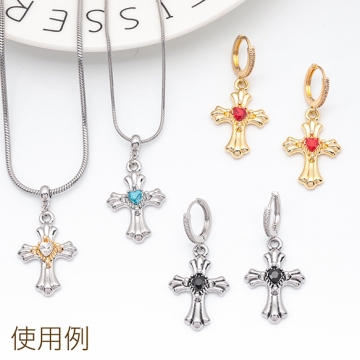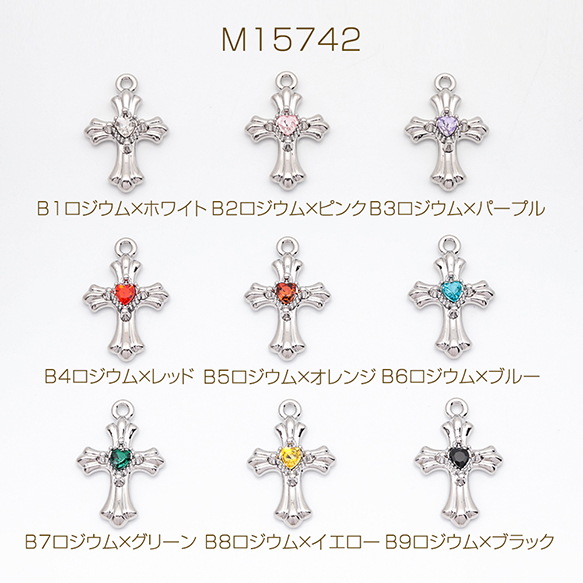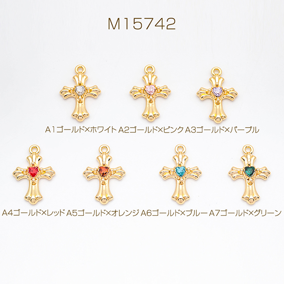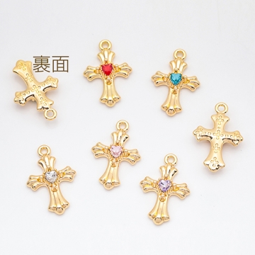 クロスチャーム カラフル 十字架 ハートのストーン付き クロス模様入り 立体 メタルチャーム 約20×30mm(1ヶ)
