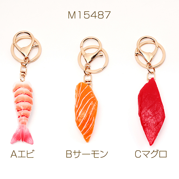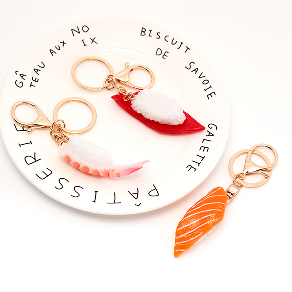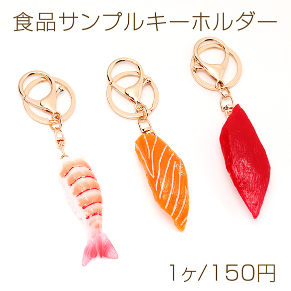 食品サンプルキーホルダー エビ サーモン マグロ 海老 鮭 鮪 にぎり寿司 食べ物 ミニチュア 全3種(1ヶ)