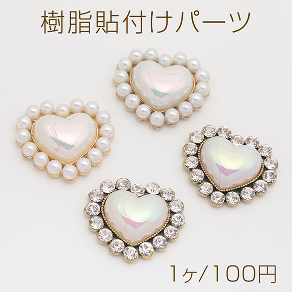 樹脂貼付けパーツ パール風 ハート ラインストーン付き デコパーツ 貼り付けパーツ 約28×32mm(1ヶ)