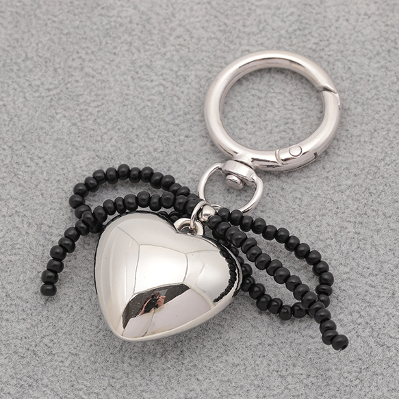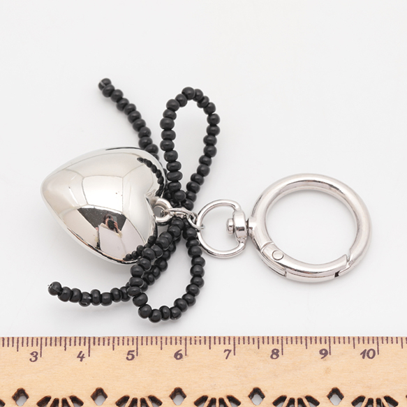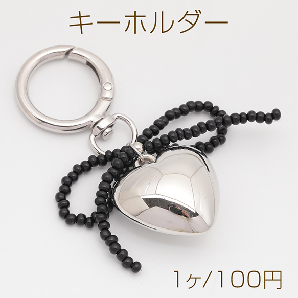 キーホルダー ハート ビーズリボン ガラスビーズ編み ロジウムカラー カラビナ付き 約7cm(1ヶ)