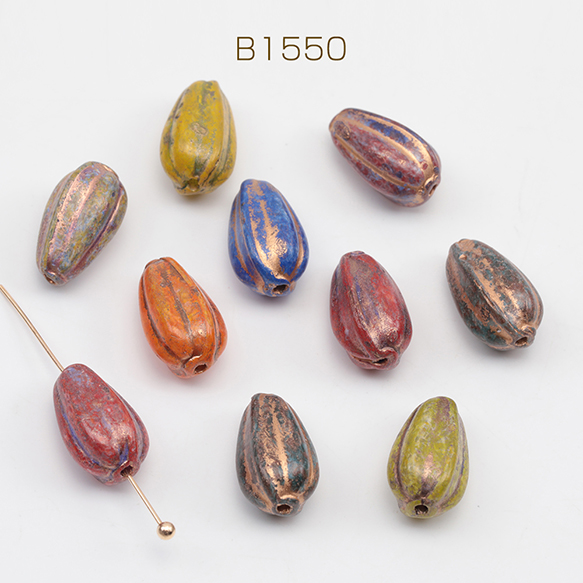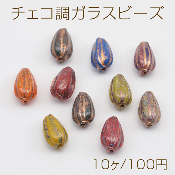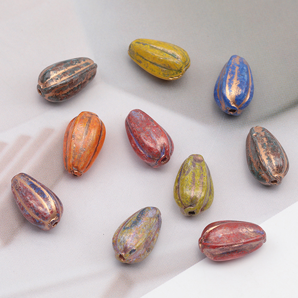 チェコ調ガラスビーズ かぼちゃ型 ドロップメロン チェコガラス風 アンティーク風 カラーランダム 約8×13mm(10ヶ)
