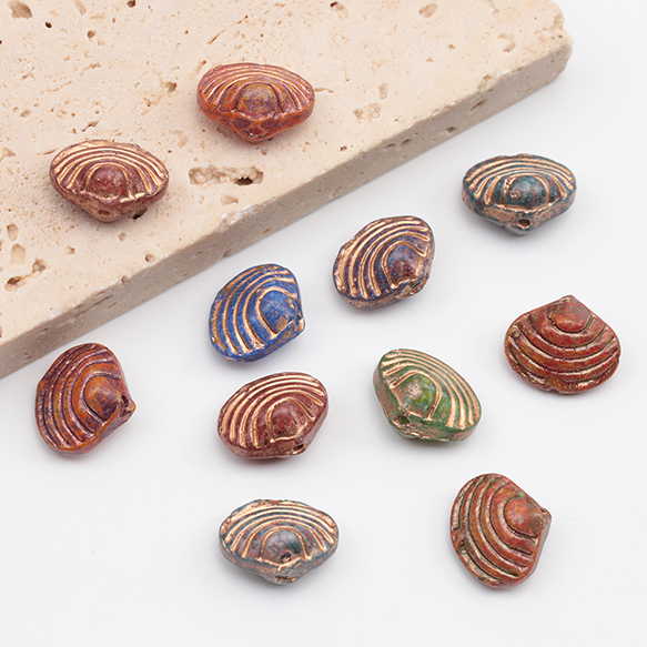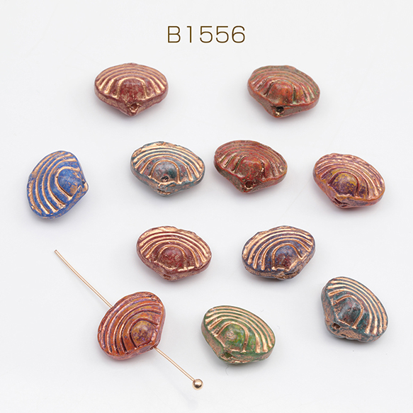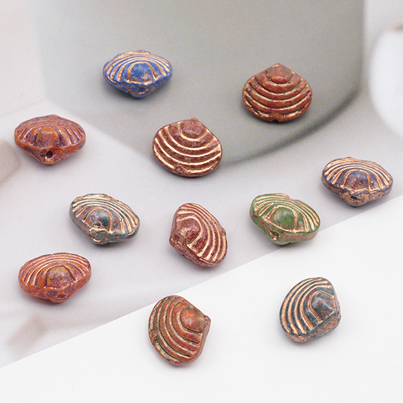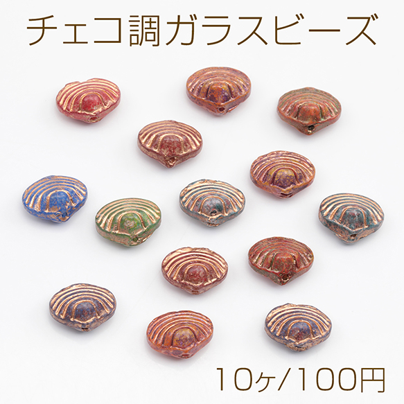 チェコ調ガラスビーズ 二枚貝 シェル型 貝 チェコガラス風 アンティーク風 カラーランダム 約10×12mm(10ヶ)