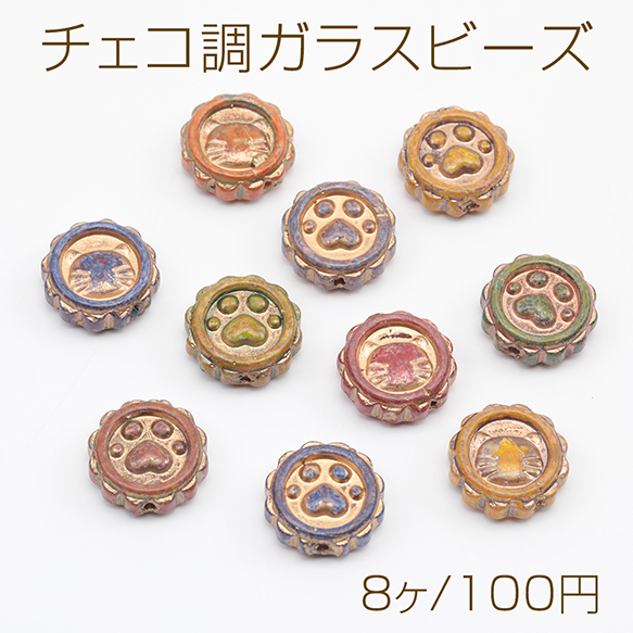 チェコ調ガラスビーズ 猫と肉球 コイン型 チェコガラス風 アンティーク風 カラーランダム 約15mm(8ヶ)
