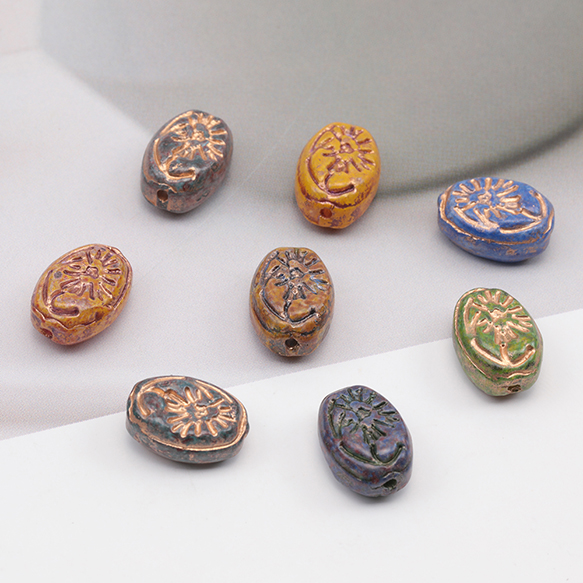 チェコ調ガラスビーズ 花模様 オーバル チェコガラス風 アンティーク風 カラーランダム 約8×12mm(10ヶ)