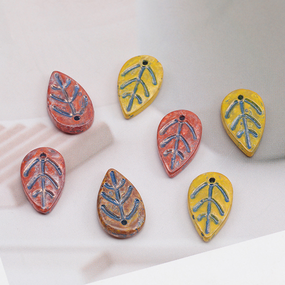 チェコ調ガラスビーズ 葉っぱ リーフ チェコガラス風 アンティーク風 カラーランダム 約10×18mm(10ヶ)