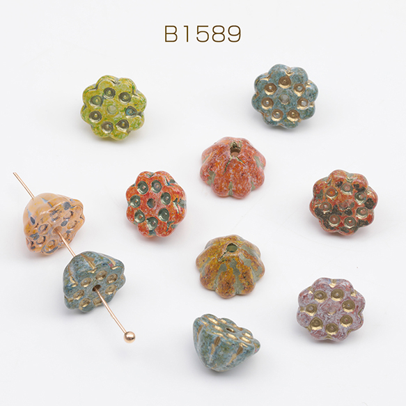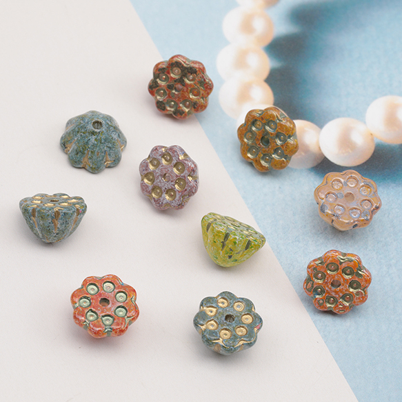 チェコ調ガラスビーズ 蓮の花 フラワー 立体 チェコガラス風 アンティーク風 カラーランダム 約7×10mm(10ヶ)