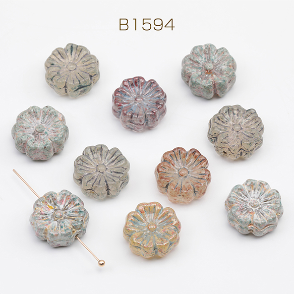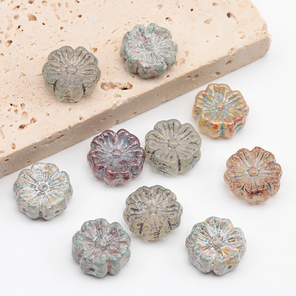 チェコ調ガラスビーズ お花 花形 フラワービーズ チェコガラス風 アンティーク風 カラーランダム 約14mm(8ヶ)