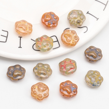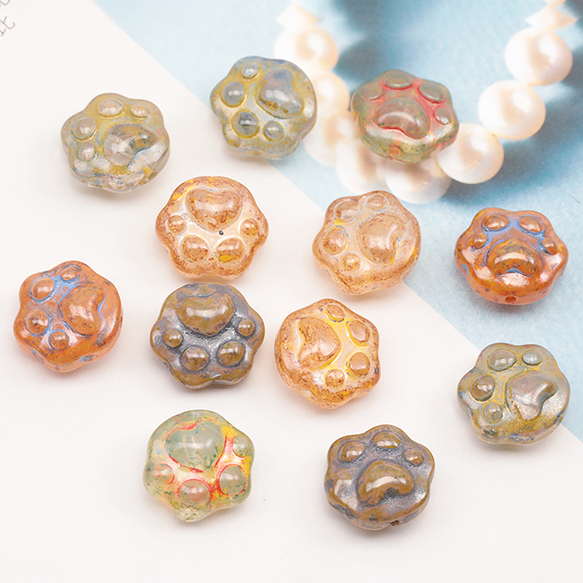 チェコ調ガラスビーズ にくきゅう 肉球 イヌ ネコ チェコガラス風 アンティーク風 カラーランダム 約13×15mm(10ヶ)