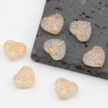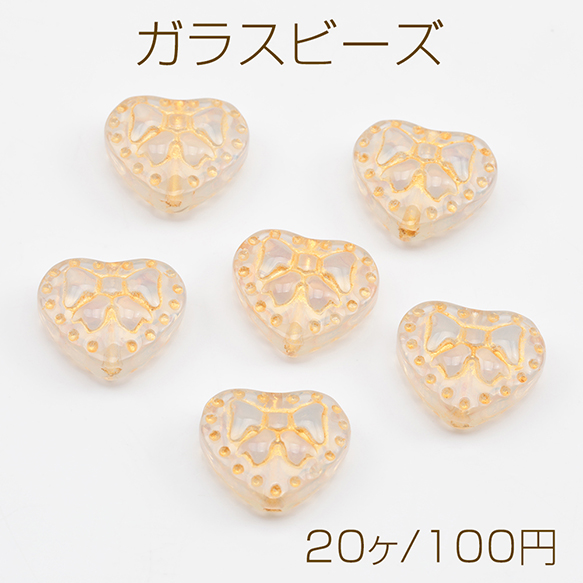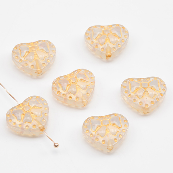 ガラスビーズ 金模様 ハート アンティーク風 半透明 乳白色 縦穴 半クリアビーズ 約14×16mm(20ヶ)