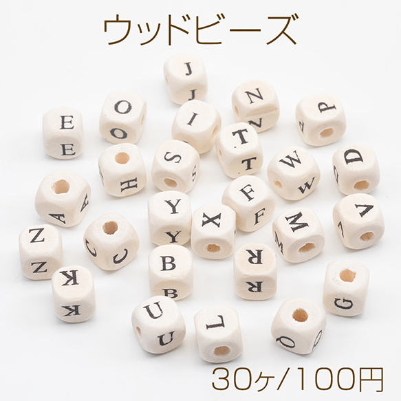 ウッドビーズ 木製 サイコロ型 角丸 アルファベット ミックスビーズ ※文字はランダム 約10mm(30ヶ)