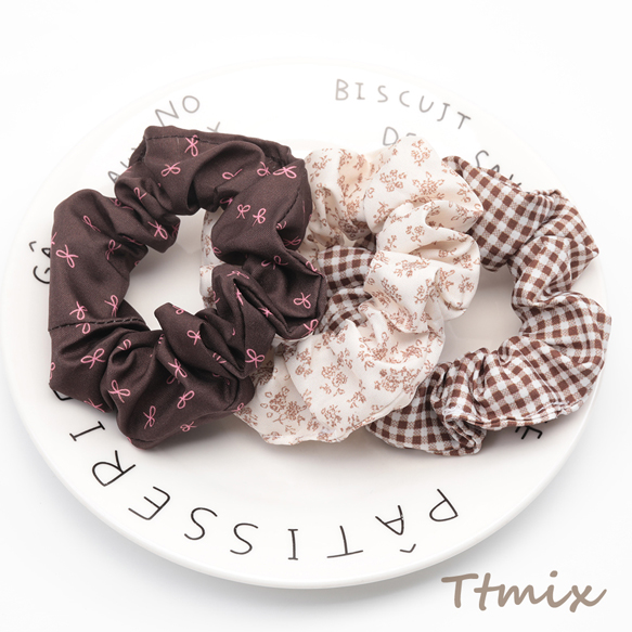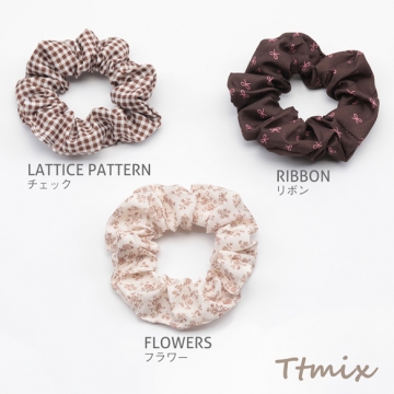 シュシュ ブラウン シンプル チェック リボン フラワー 髪飾り 髪留め ヘアゴム ヘアアクセサリー(1ヶ)