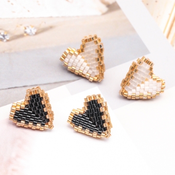 デザインピアス ハートモチーフ ガラスビーズ 編みチャーム スタッドピアス メタルチャーム 約16×18mm(1ペア)