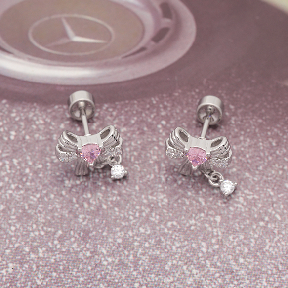 卸売バーベルピアス リボン/うさぎ ピンクストーン付き ステンレス製 メッキ加工 デザインピアス 約8×10mm( 1ペア)