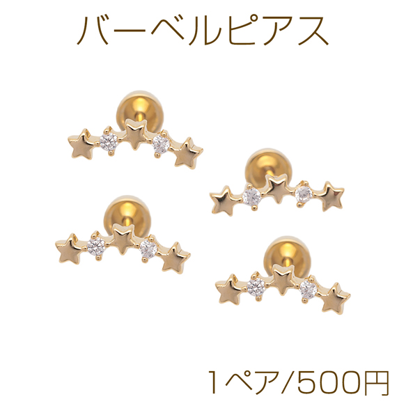 卸売バーベルピアス 星とラインストーン ステンレス製 メッキ加工 デザインピアス 約4×11mm( 1ペア)