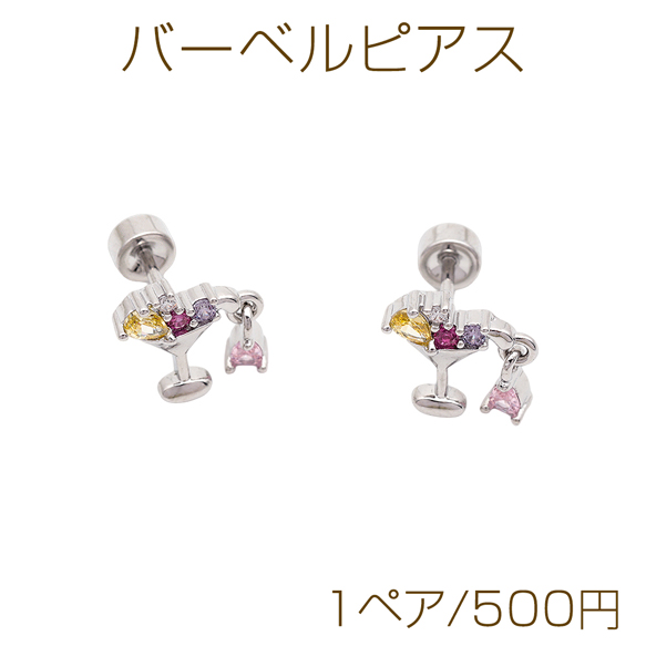 卸売バーベルピアス カクテル グラス カラフル ストーン付き ステンレス製 メッキ加工 デザインピアス 約9×10mm( 1ペア)
