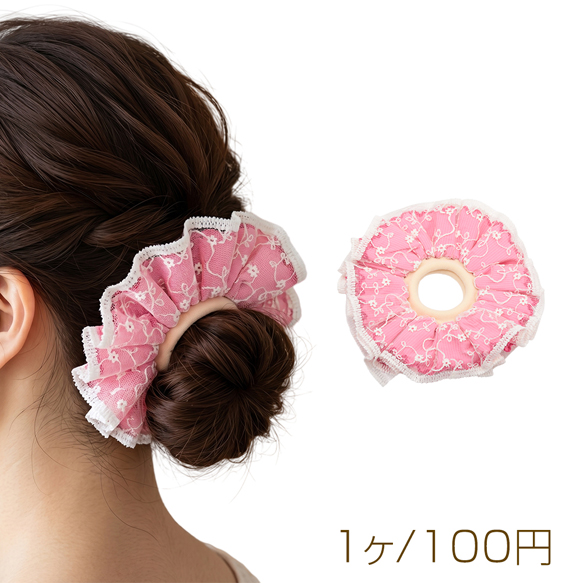 シュシュ フラワー ふんわり二重レース ピンク フリルシュシュ 髪飾り 髪留め ヘアゴム ヘアアクセサリー 約10cm(1ヶ)