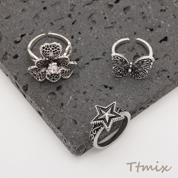 デザインリング フラワー 蝶 ヴィンテージ風 アンティークシルバー メタルリング オープンリング 全6種(1個)