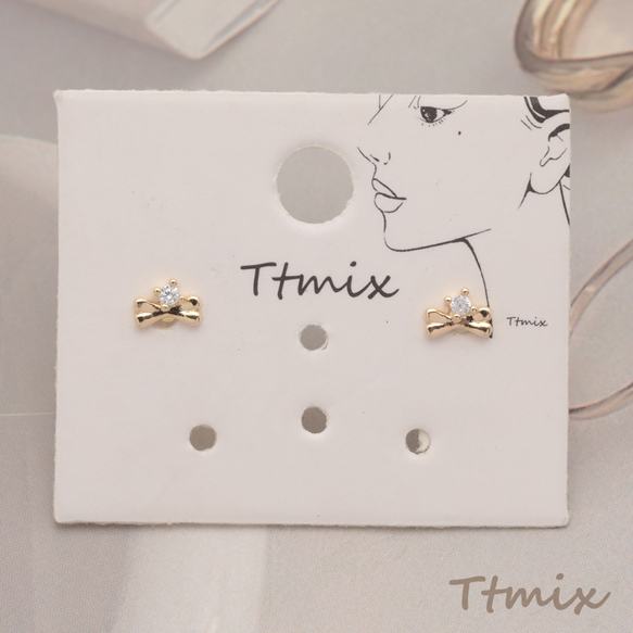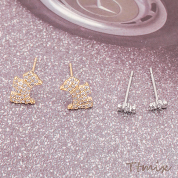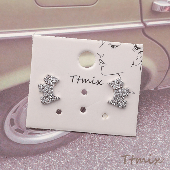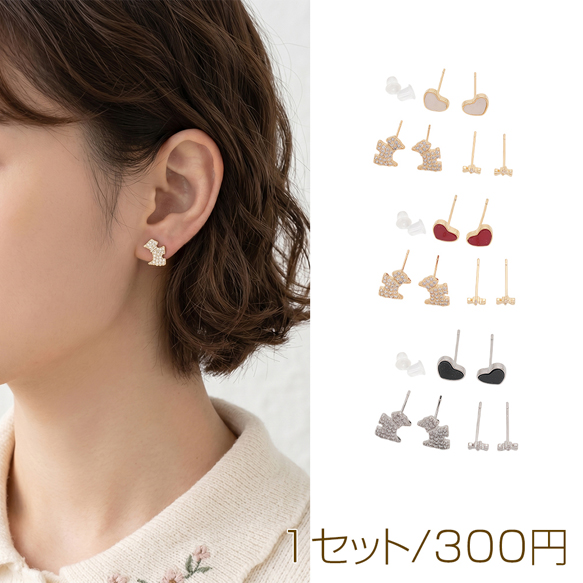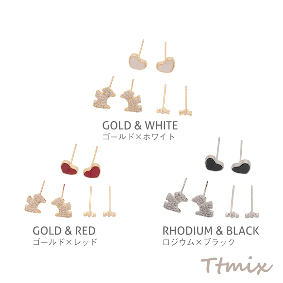 デザインピアス ハート 犬 リボン ラインストーン付き スタッドピアス 3種(1セット)