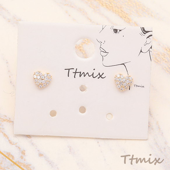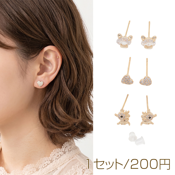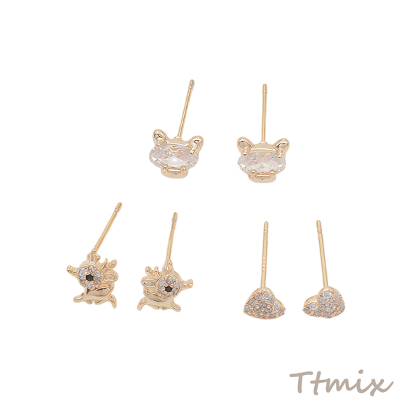 デザインピアス 猫 トナカイ ハート ジルコニア スタッドピアス 3種(1セット)