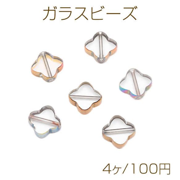 ガラスビーズ 四つ葉のクローバー クリア オーロラメッキの縁 研磨加工 フラットビーズ 約10×10mm(4ヶ)