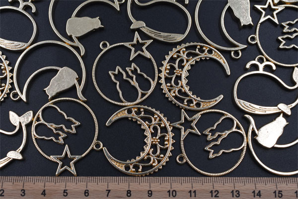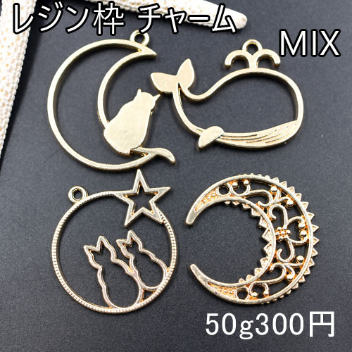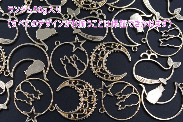 レジン枠 チャームパーツミックス MIX 月と猫 鯨ちゃん 星と猫 透かし月【50g】ゴールド