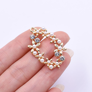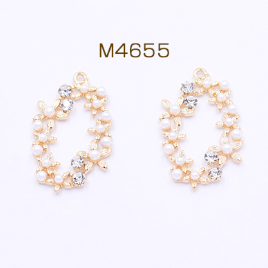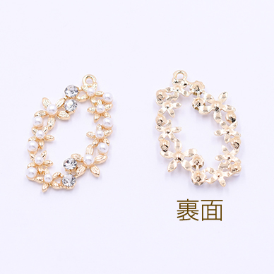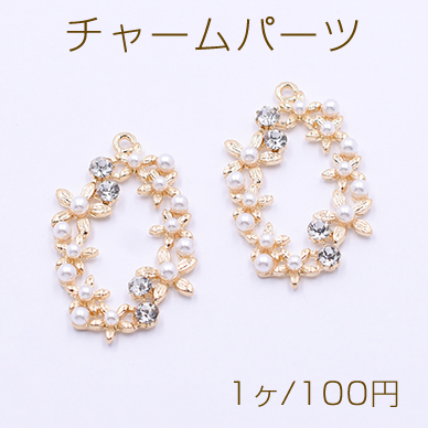 チャームパーツ 小花のオーバル パールと石付き 23×37mm ゴールド/ホワイト【1ヶ】