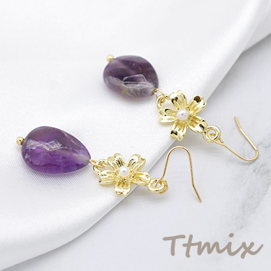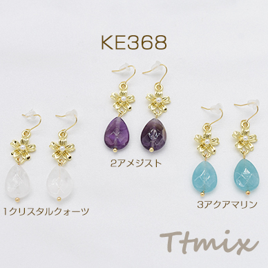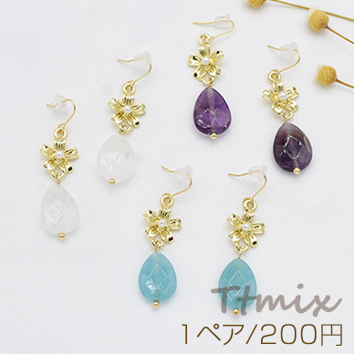 天然石ピアス パール付きフラワー×雫カット 金属フックピアス【1ペア】
