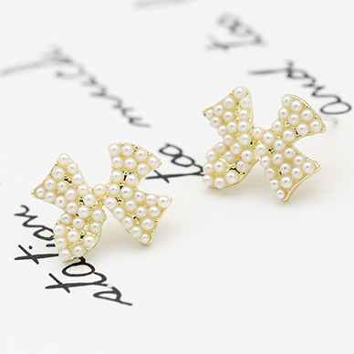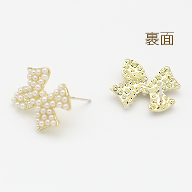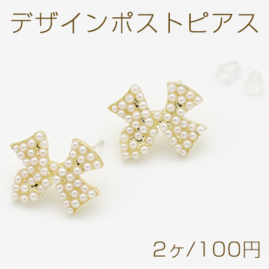 デザインポストピアス パール付き リボン 15×19mm ゴールド【2ヶ】