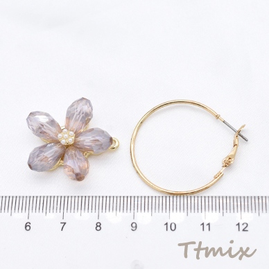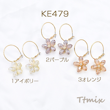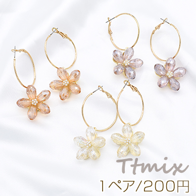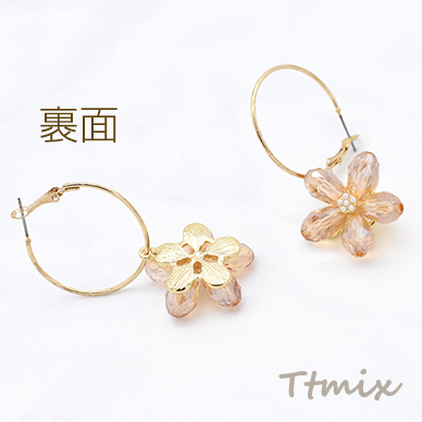 ガラスピアス パール付き 5弁花 フープピアス ゴールド【1ペア】