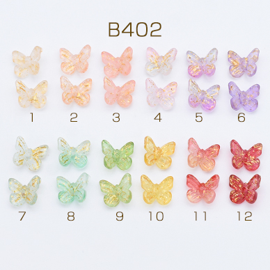 ガラス製蝶ビーズ チェコ調ガラスビーズ 金箔模様入り 蝶モチーフ 縦穴 10×11mm 全12色