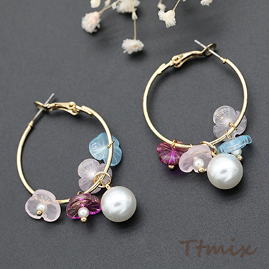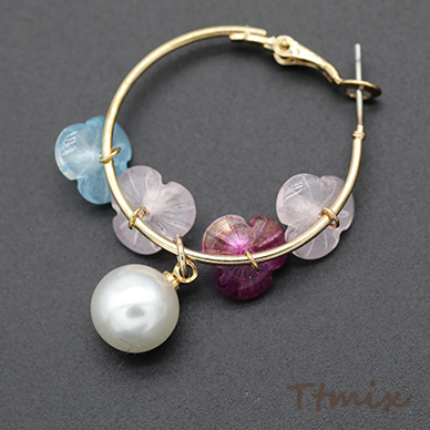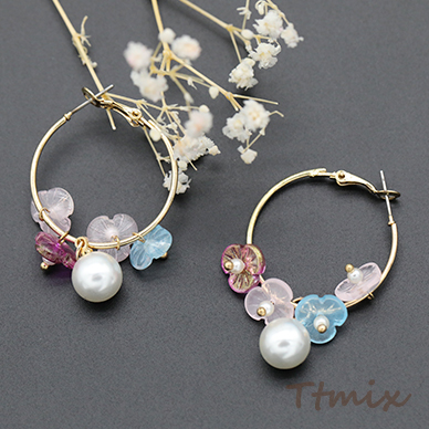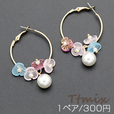 ガラスフラワー×アクリルパール調ピアス フープピアス【1ペア】