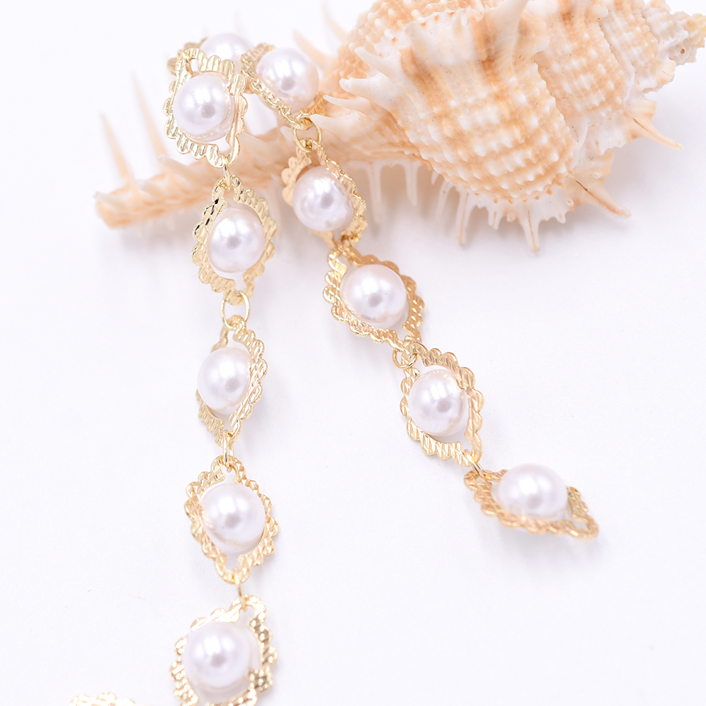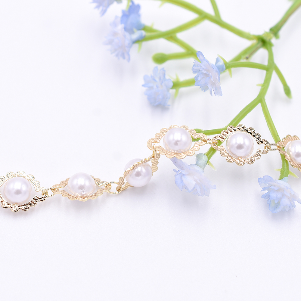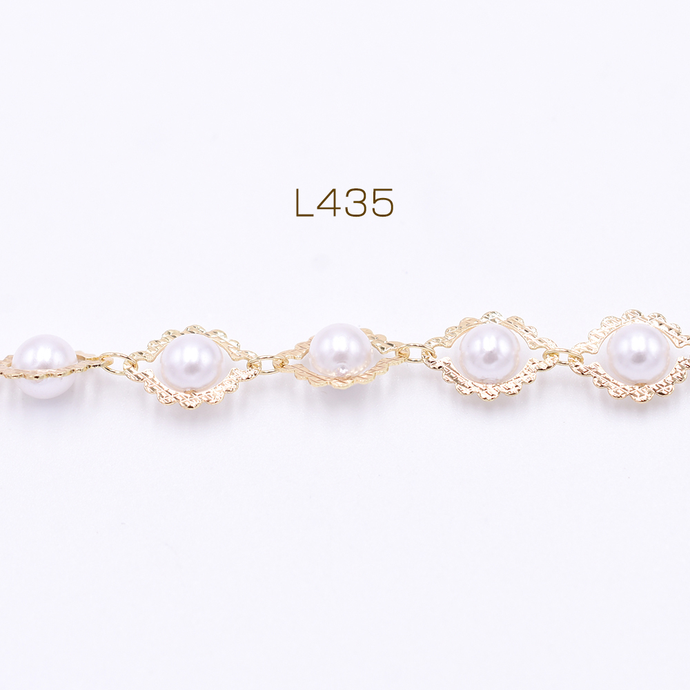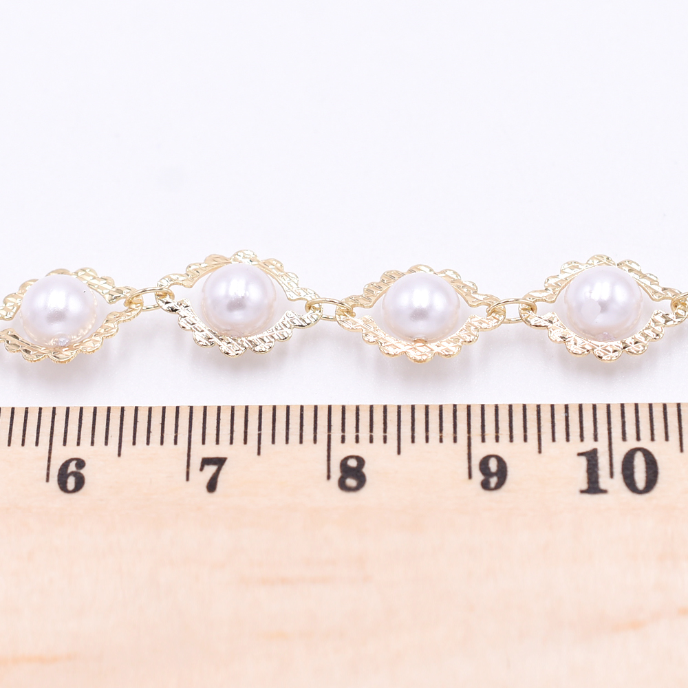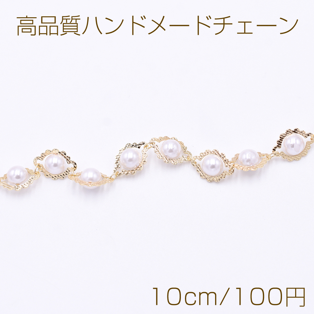 高品質ハンドメードチェーン 菱形&パール 9×12.5mm ゴールド/ホワイト【10cm】