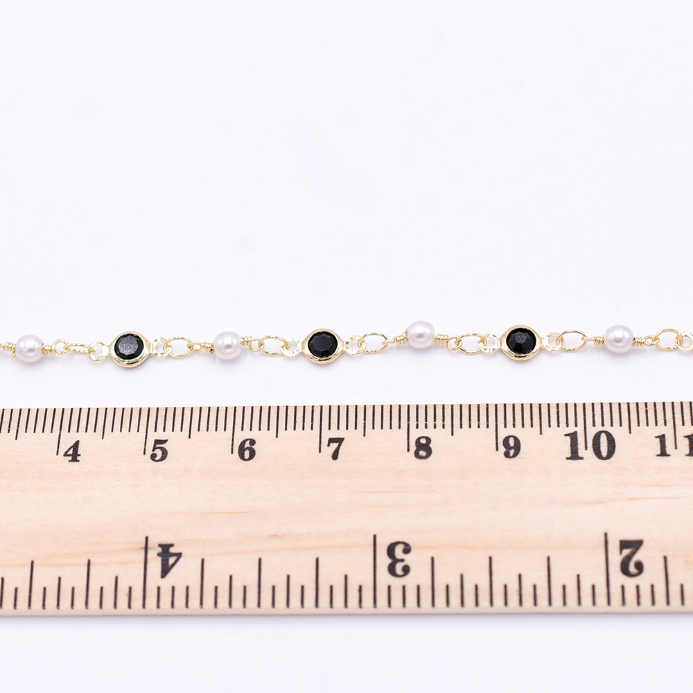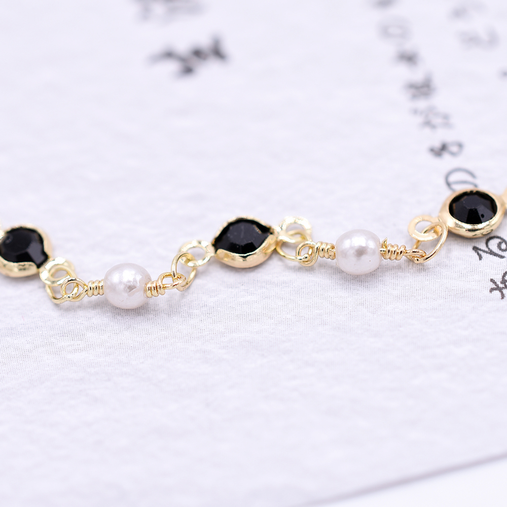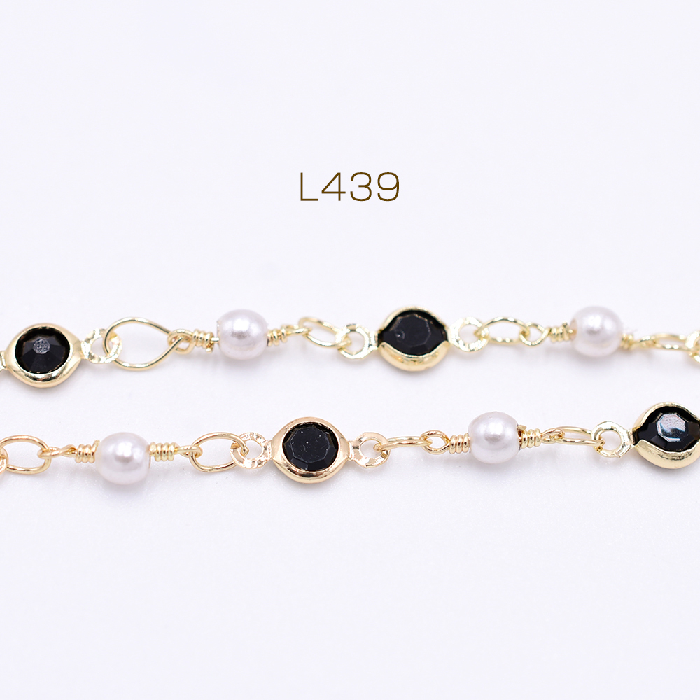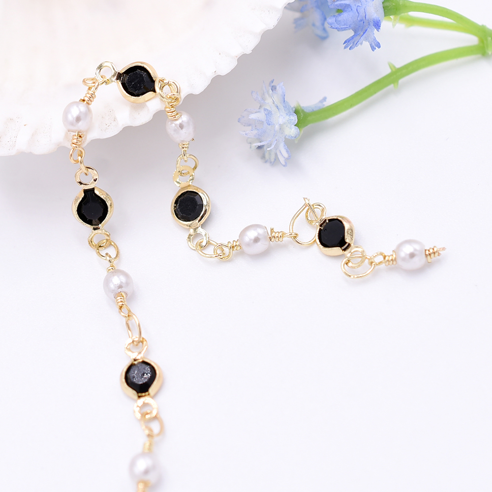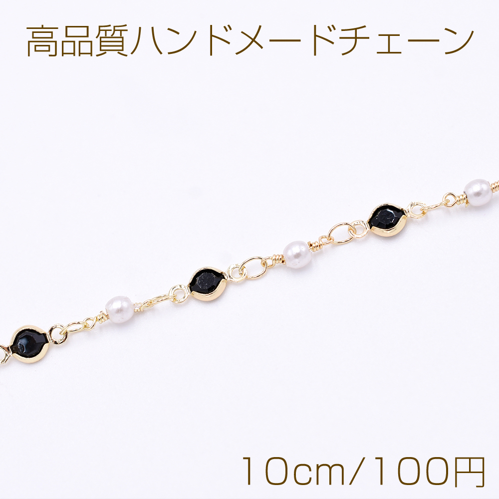 高品質ハンドメードチェーン パール&ガラス 3mm&4.5mm ゴールド/ブラック【10cm】