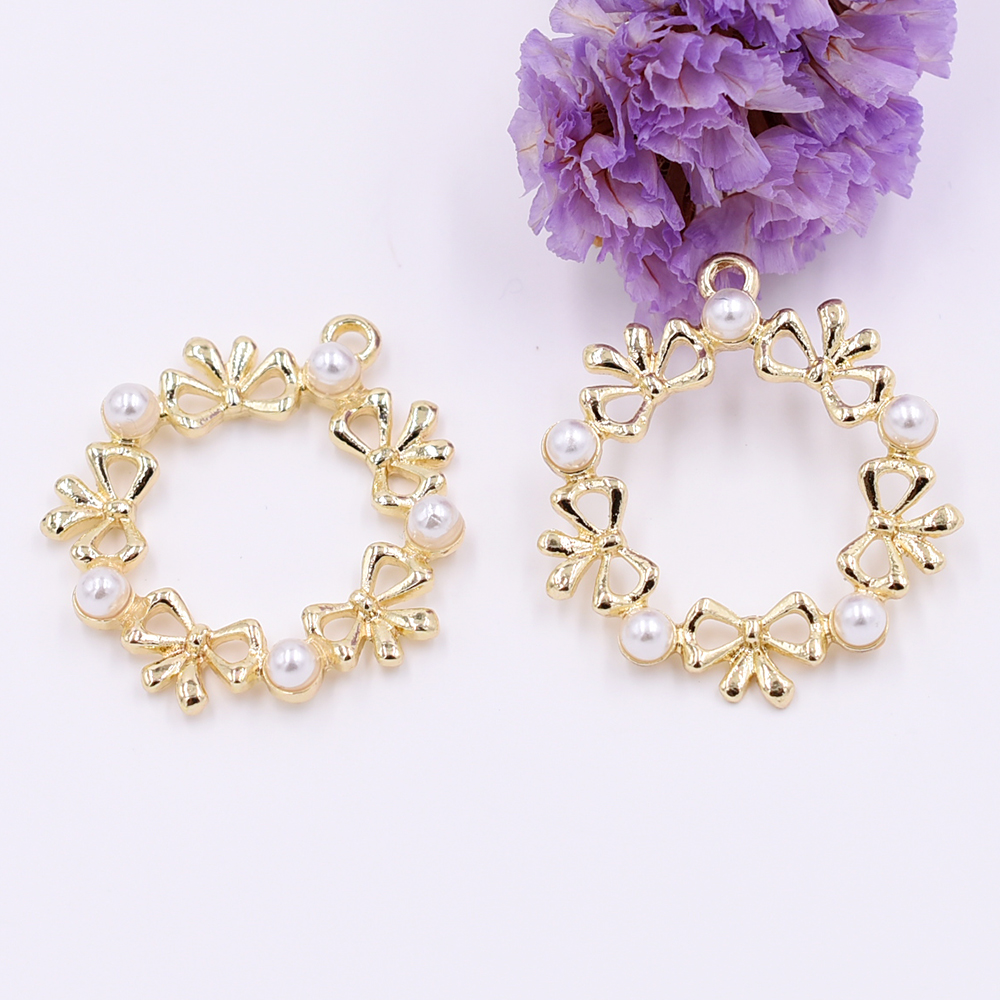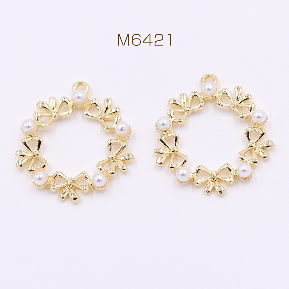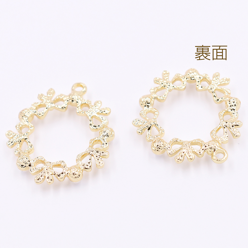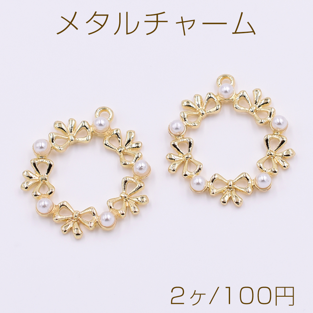 メタルチャーム 丸型 リボン パール付き 1カン 18×22mm ゴールド【2ヶ】