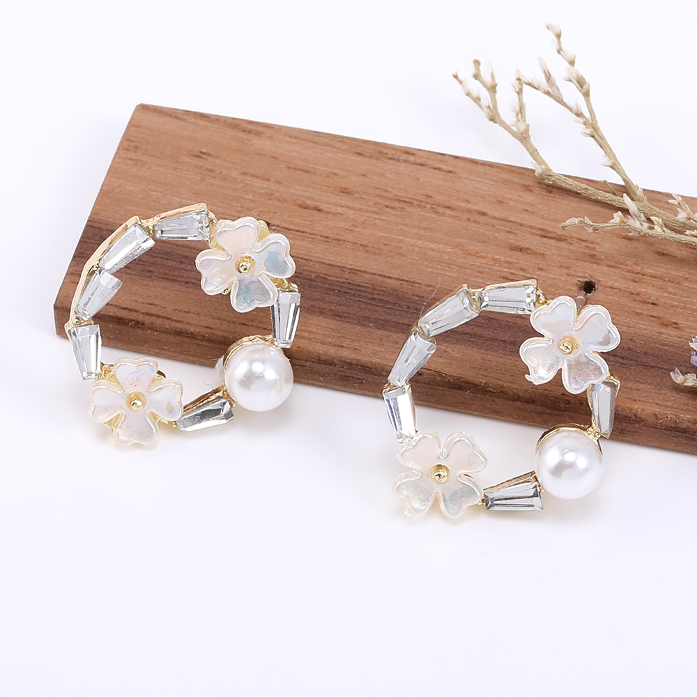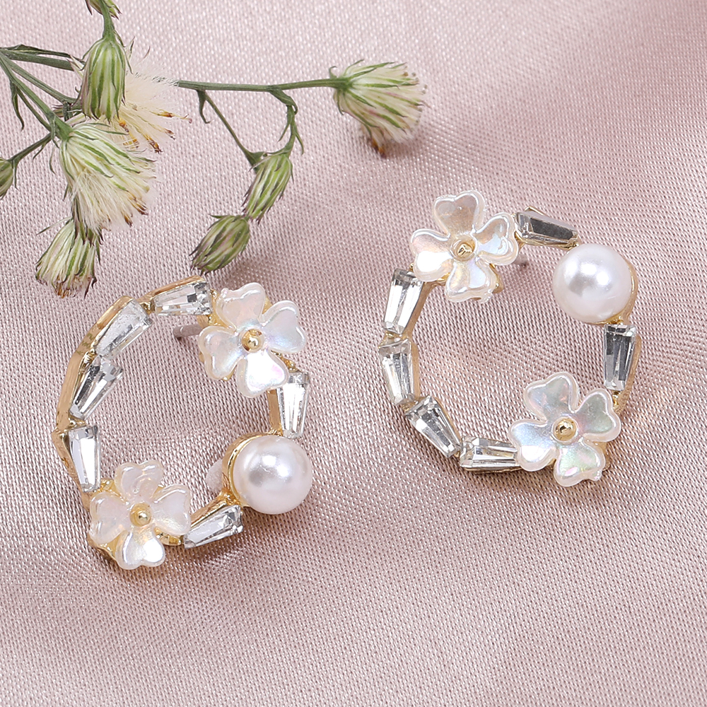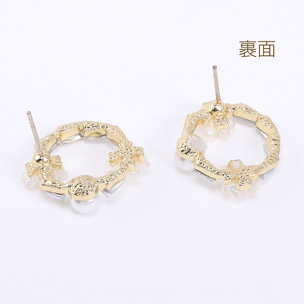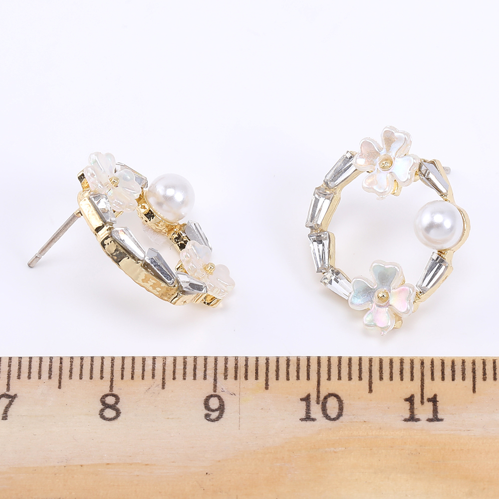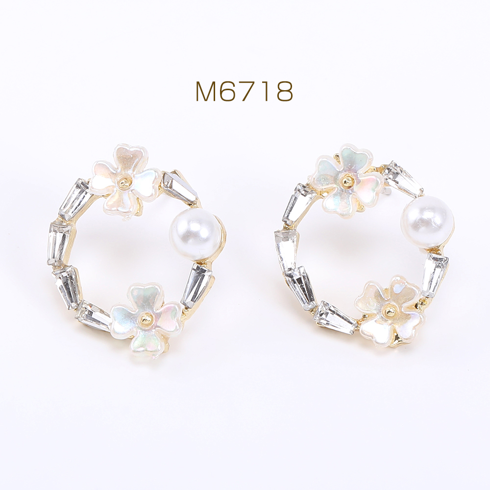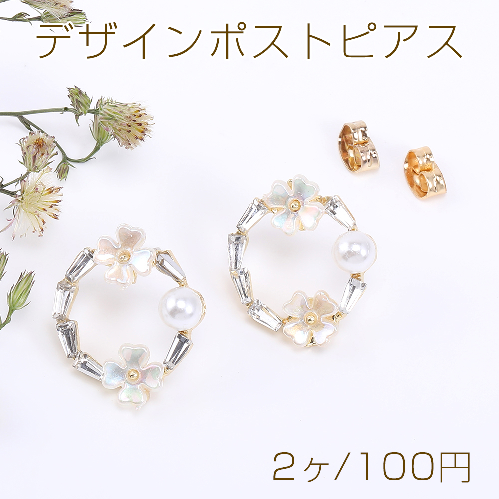 デザインポストピアス フープピアス 樹脂フラワー&パール&石付き 16×19mm ゴールド【2ヶ】