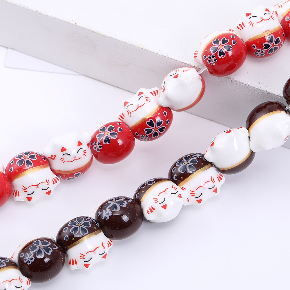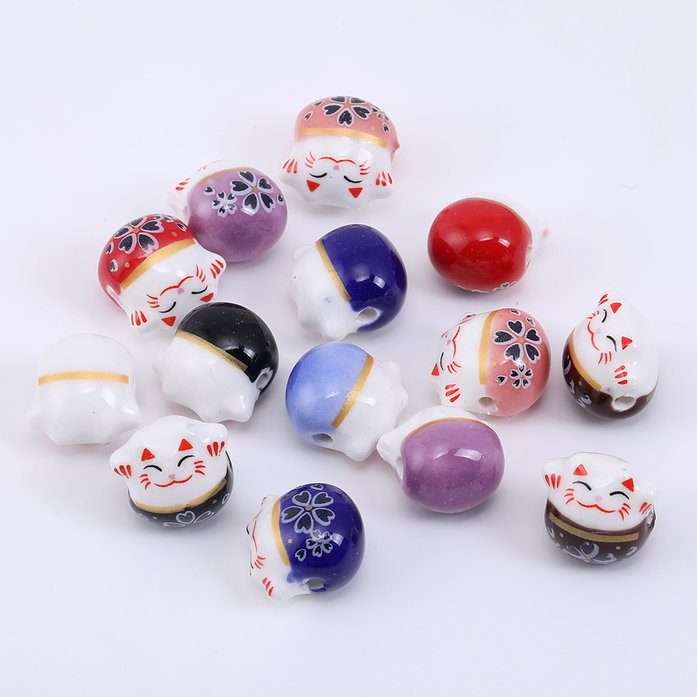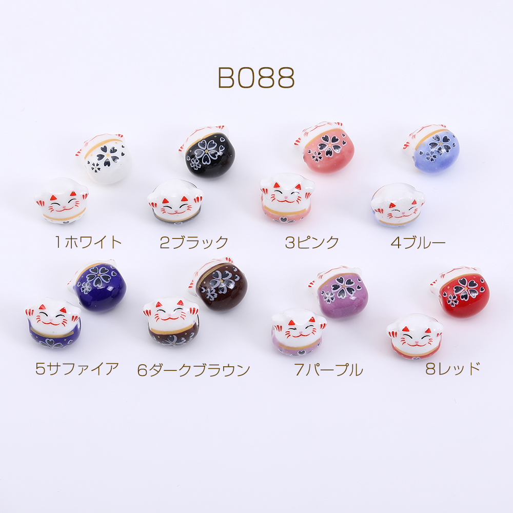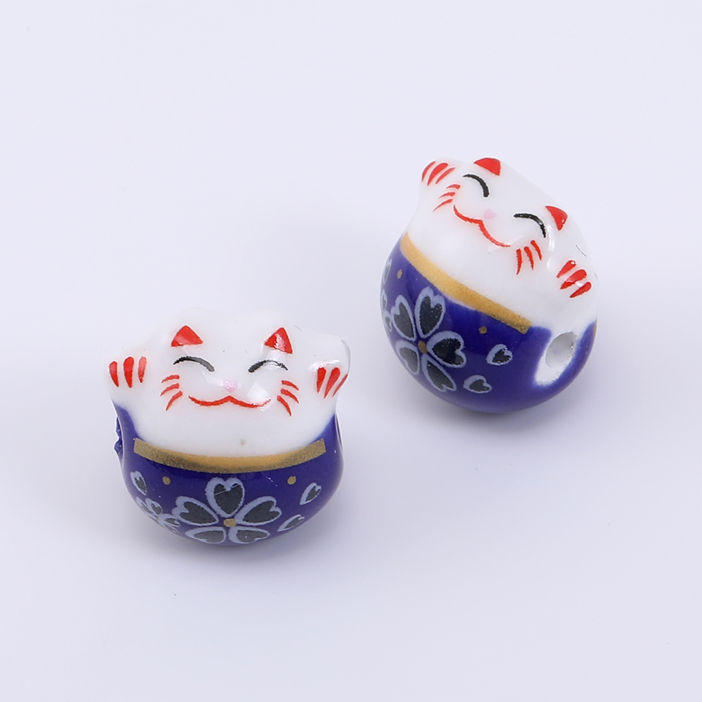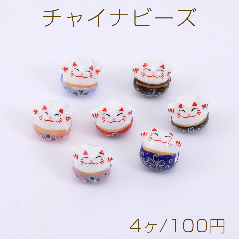 チャイナビーズ 陶器ビーズ 招き猫 13×14mm 横穴 フラワー柄【4ヶ】