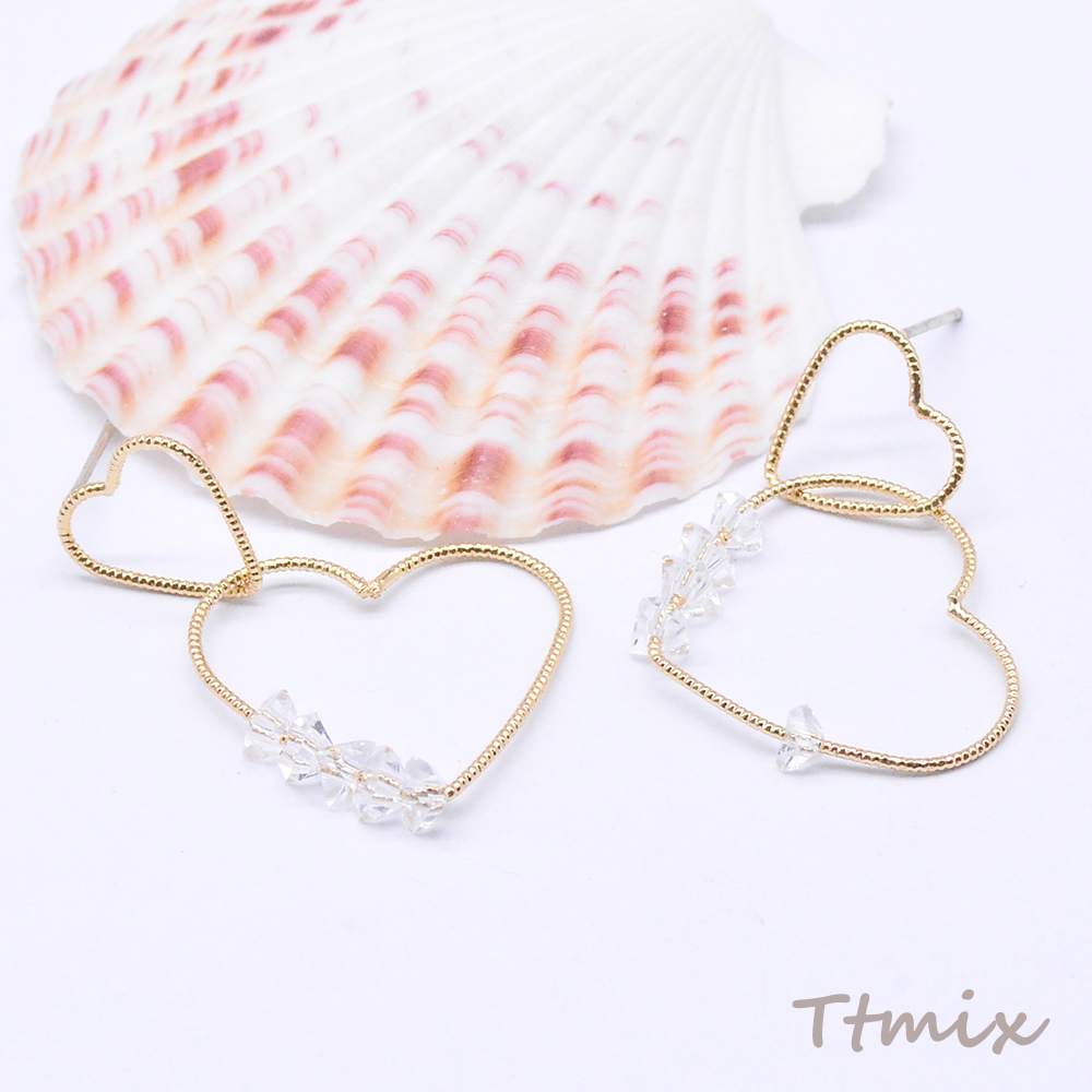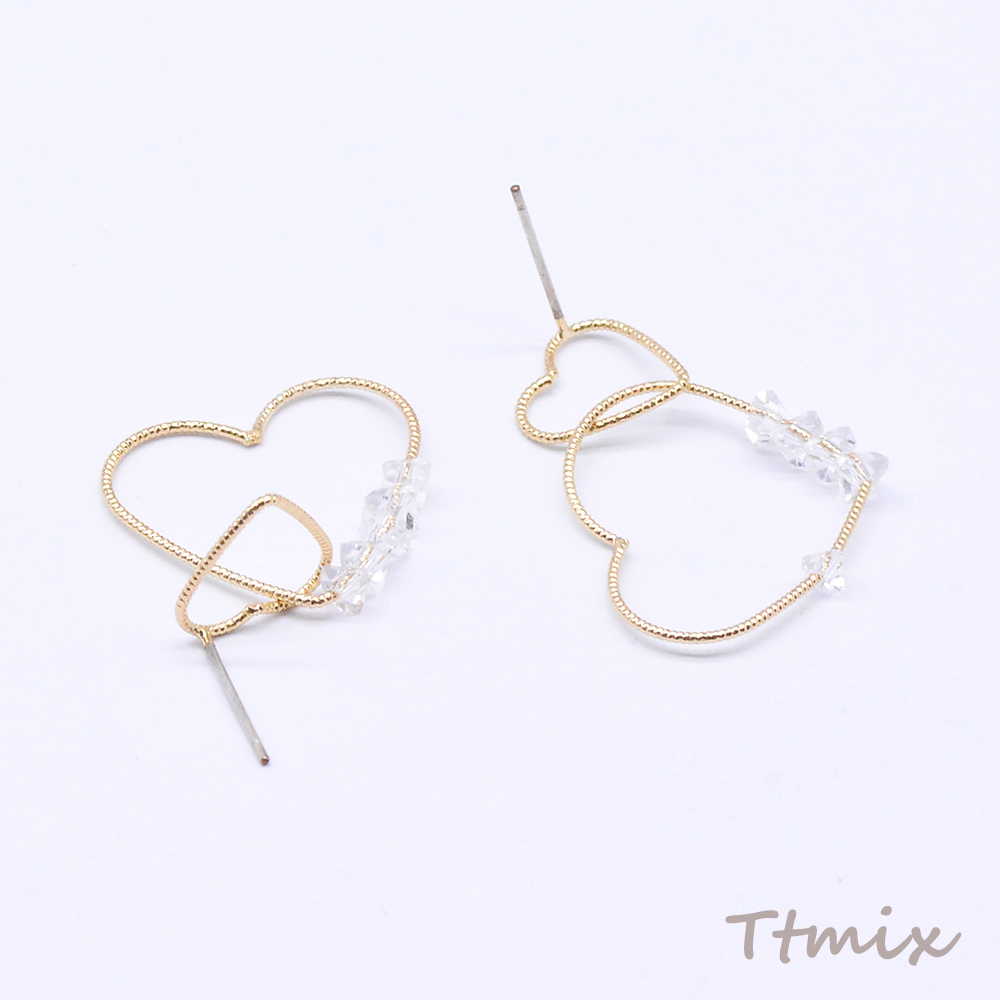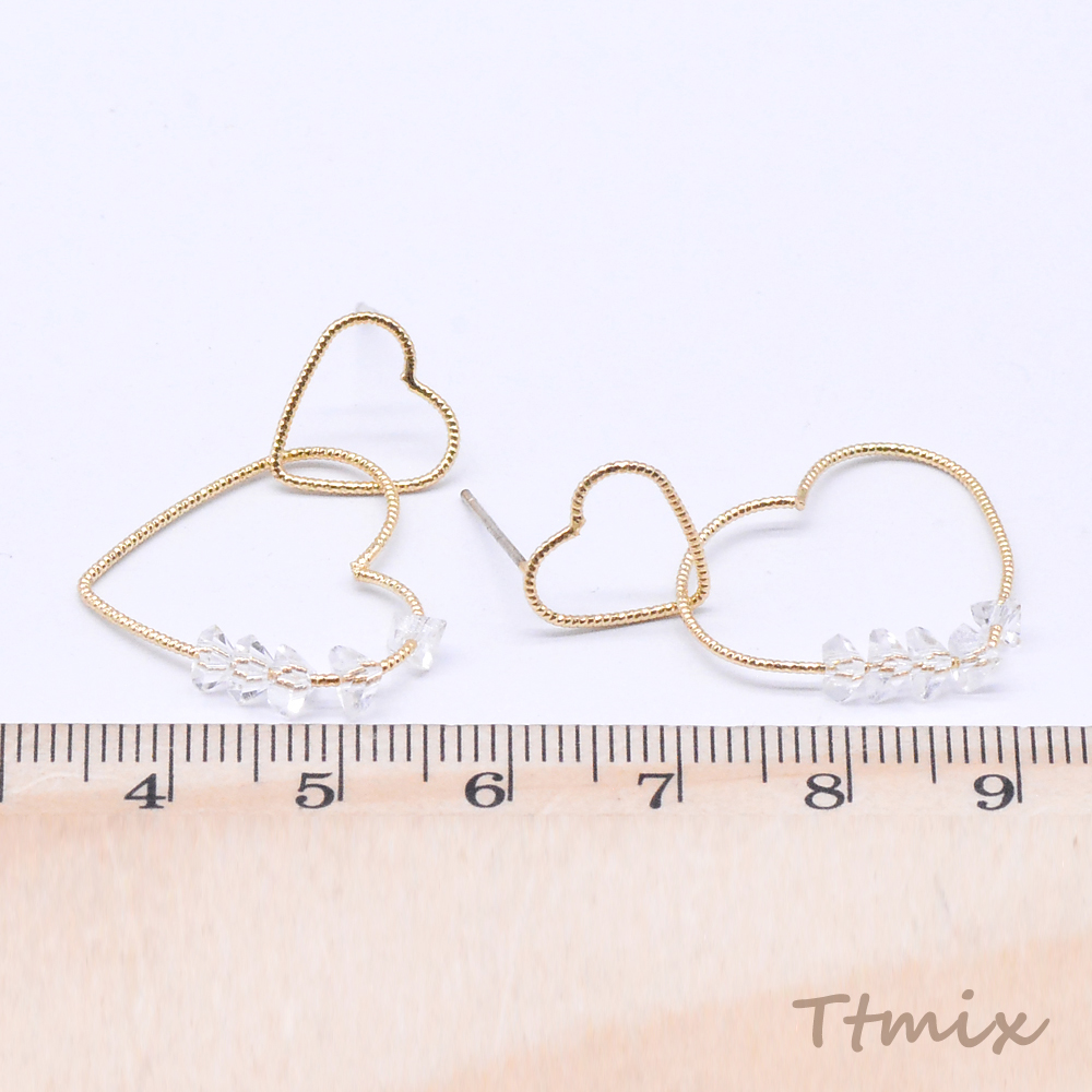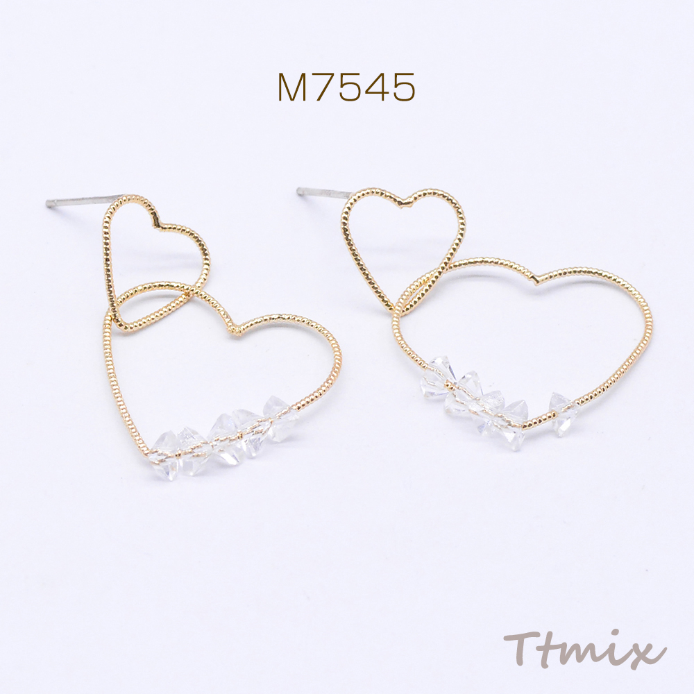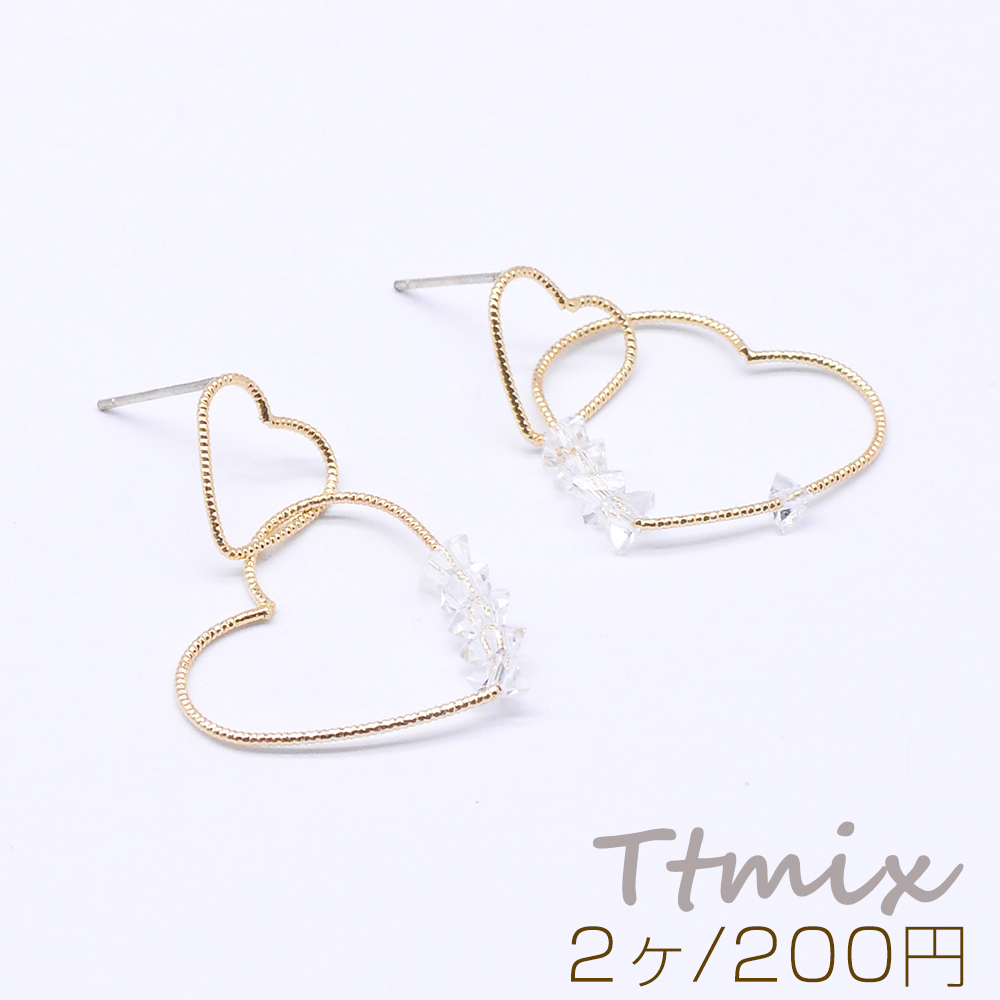 デザインピアス 2連ハート型 ガラスビース付き 22×31mm ゴールド(2ヶ)