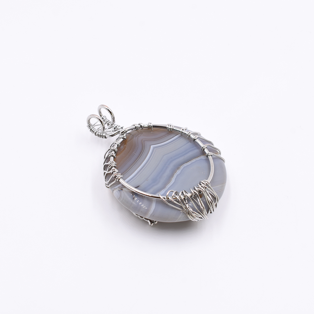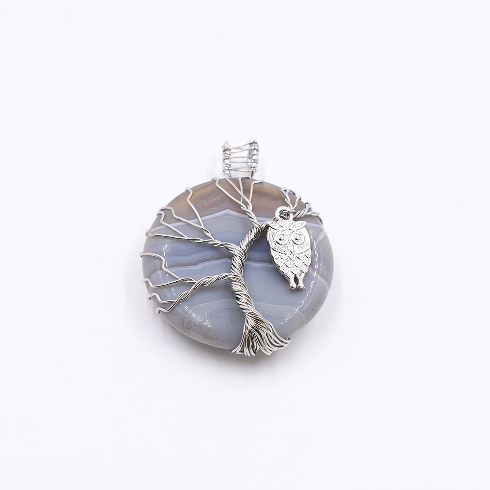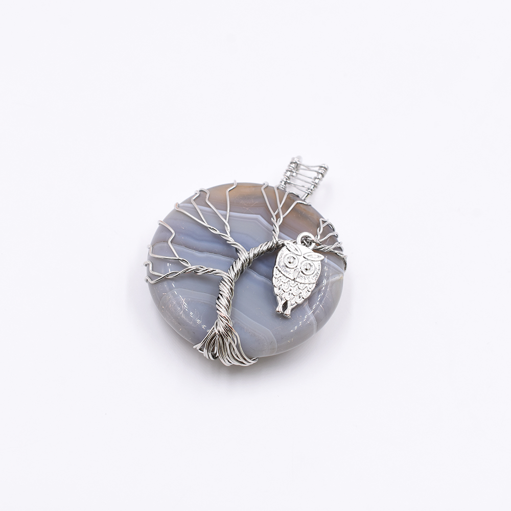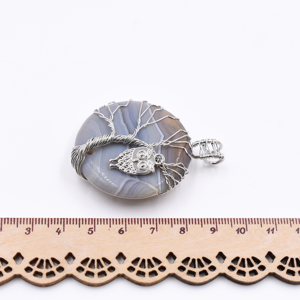 天然石チャーム ラウンド 2カン グレーアゲート ツリーとフクロウ 52x40mm ロジウム (1ヶ)
