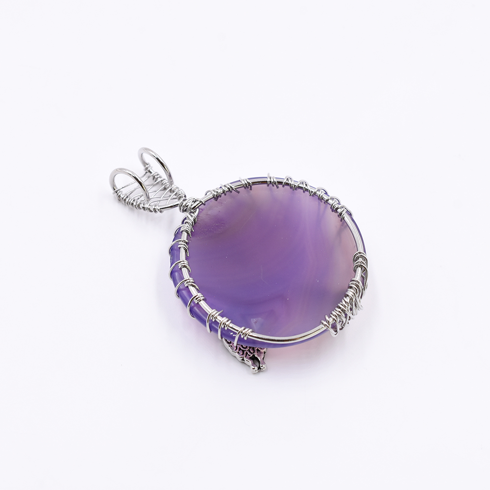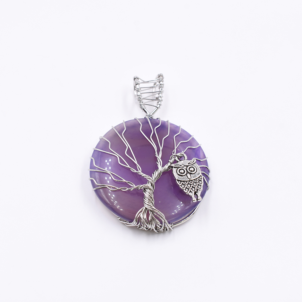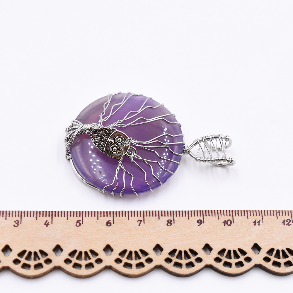 天然石チャーム ラウンド 2カン パープルアゲート ツリーとフクロウ 59x40mm ロジウム (1ヶ)