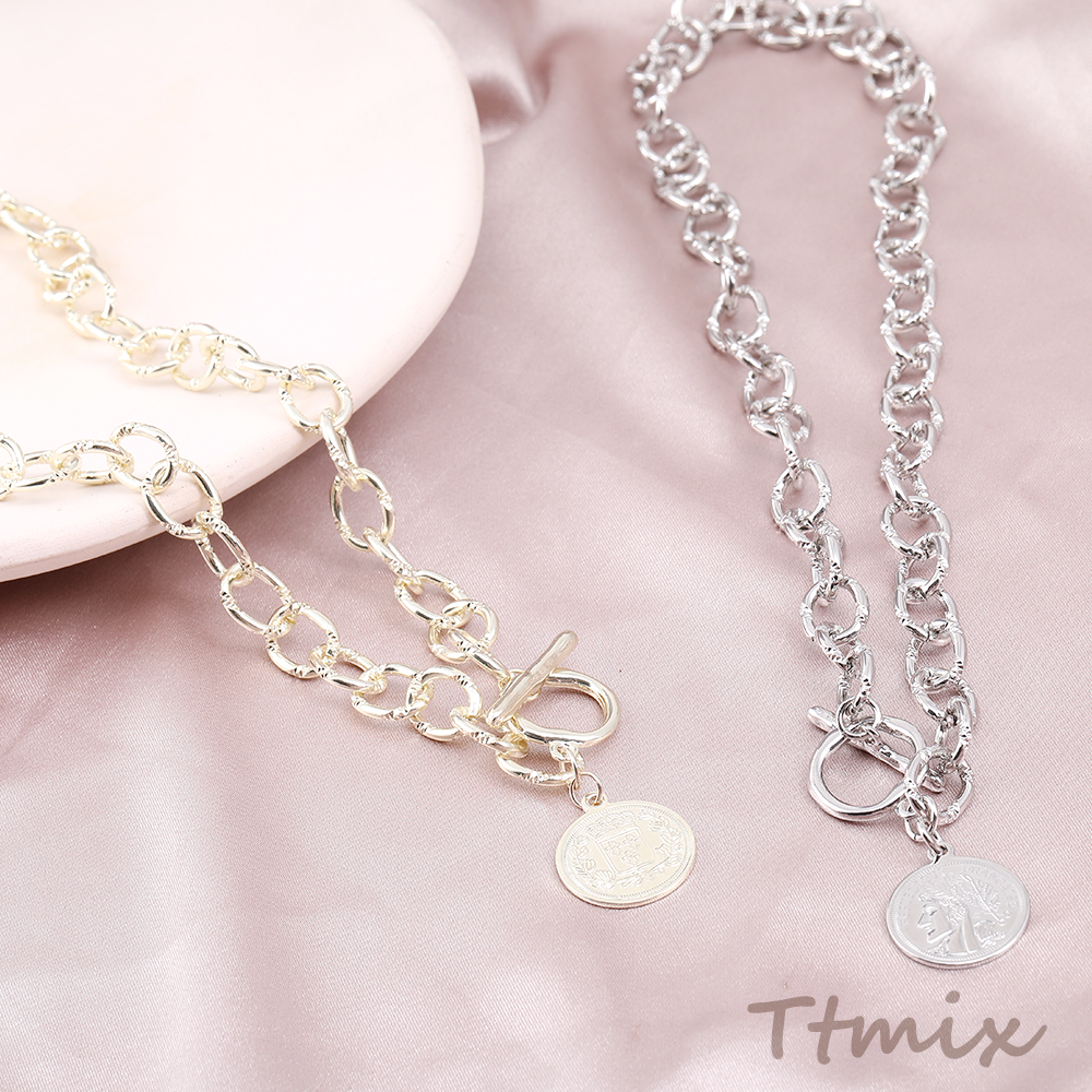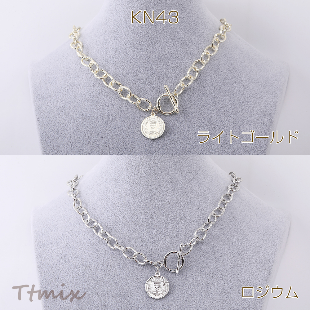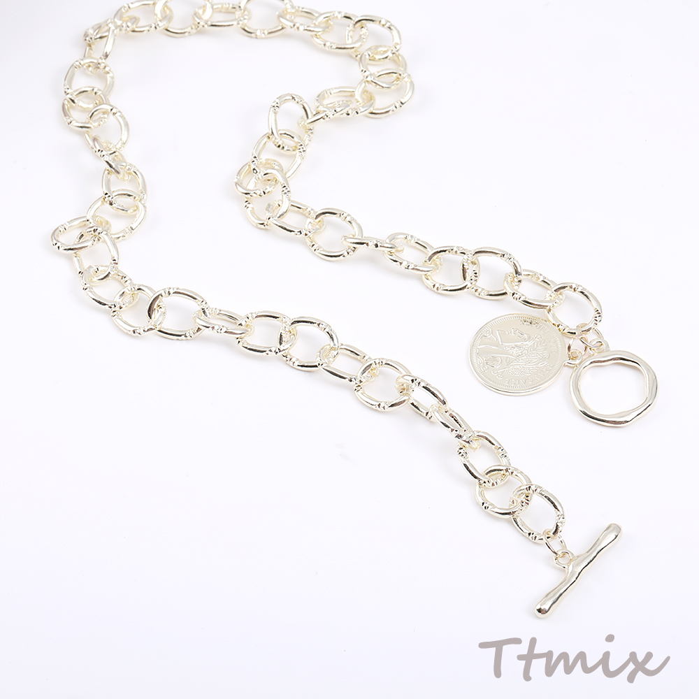 高品質メタルネックレス 模様入りオーバルチェーン コインチャーム(1連)
