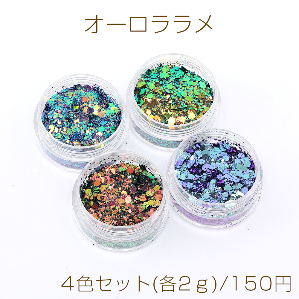 オーロララメ ケース付き ネイルパーツ レジン封入パーツ 六角形D 4色セット(各2g)